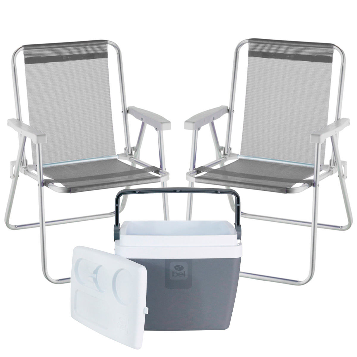 2x Cadeira de Praia Alta Lazy em Alumínio Suporta 110kg + Caixa Térmica 12L 13 Latas 350ml Cinza BEL