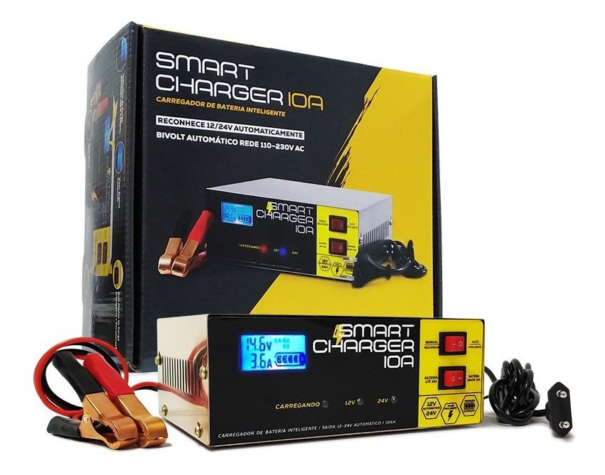 Descrição Carregador Smartcharger 10AH Com Visor Digital Entrada 110V a 220V Bivolt - saída de 12V a 24V Automático Certificado Pelo Inmetro: