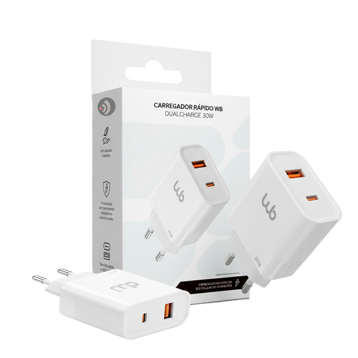 Com o Carregador WB DualCharge 30w você poderá recarregar seus dispositivos rapidamente tanto pela porta USB-C de 30W ou a USB-A de 18W.
