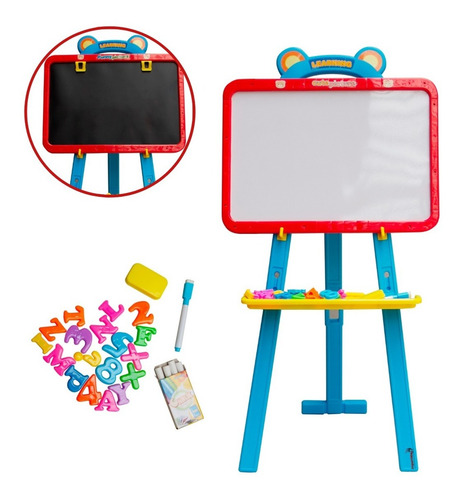 Ela acompanha giz, apagador, caneta e acessórios diversos, além de possuir também regulagem de altura e um suporte para bloco de desenho.