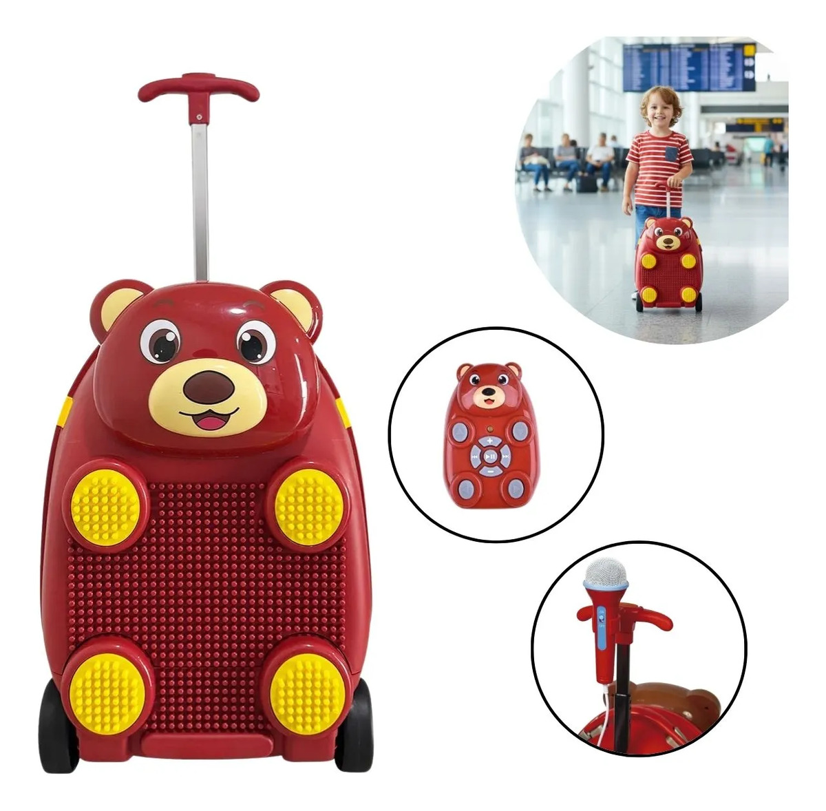 Com um design encantador de urso, a malinha é fácil de transportar e guarda várias formas de entretenimento em um único produto.