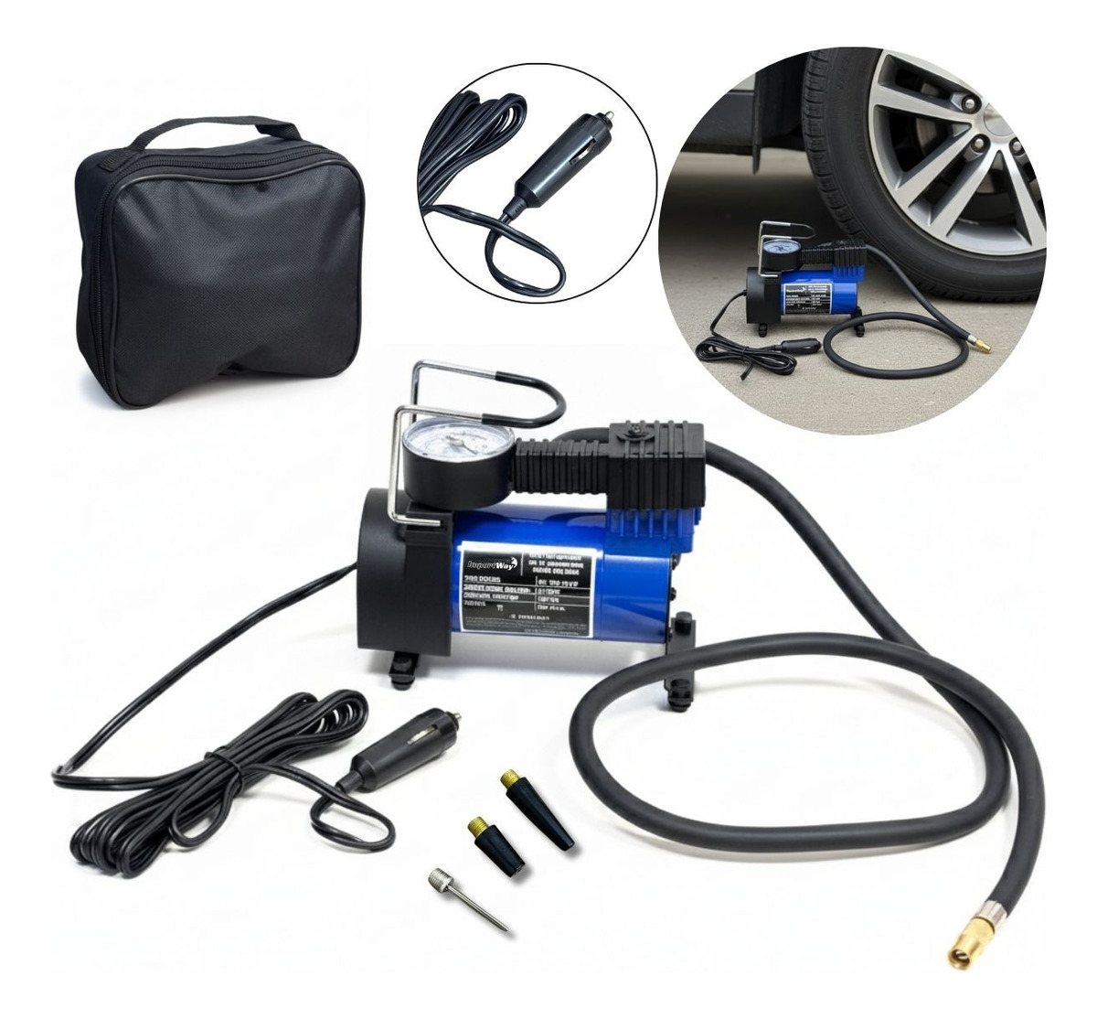 - 01 Mini Compressor de Ar Automotivo 150PSI 35L/Min Com Selante E Bolsa Armazenar ImportWay Azul
