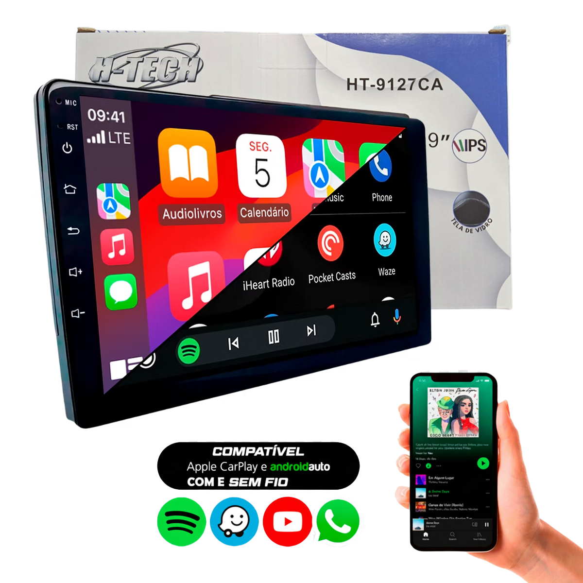 --- Descrição: Multimídia MP5 Slim 9" Full Touch HT-9127CA com CarPlay e Android Auto Sem Fio Bluetooth USB 4x60W RMS Painel IPS