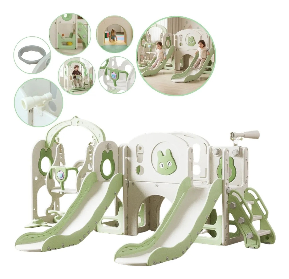 • Possui 7 funções: 2 escorregadores, balanço, cesta de basquete, telescópio, ponte, espaço multifuncional inferior e reprodutor de música